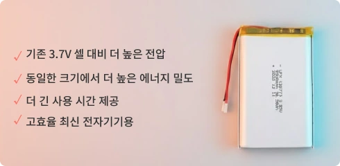 기존 3.7V 배터리는 공간 제한 설계에서 총 에너지 출력을 제한합니다. 사용 시간을 늘리려면 일반적으로 셀을 추가해야 하는데, 이는 비용, 설계 복잡성, 크기를 증가시킵니다.